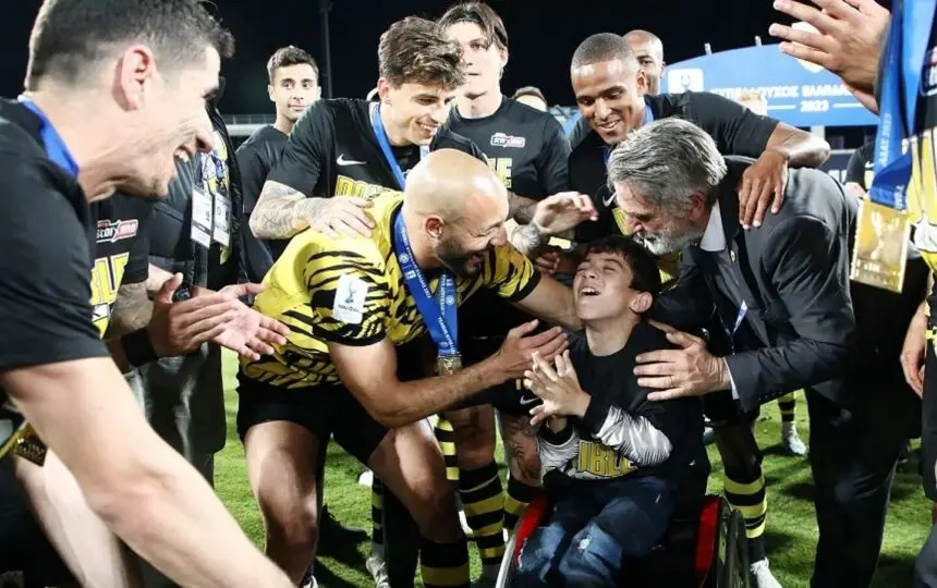 Τα μέλη της κιτρινόμαυρης αποστολής υποδέχθηκαν ανάμεσά τους ένα μικρό φίλο του ΠΑΟΚ που καθόταν σε ανηπηρικό καροτσάκι. Οι παίκτες τον αγκάλιασαν, φωτογραφήθηκαν μαζί του και του έδωσαν να κρατήσει και το Κύπελλο Ελλάδας, χαρίζοντάς του αξέχαστες στιγμές σ’ έναν κατά τ’ άλλα ασυνήθιστο τελικό, αφού έγινε κεκλεισμένων των θυρών.
