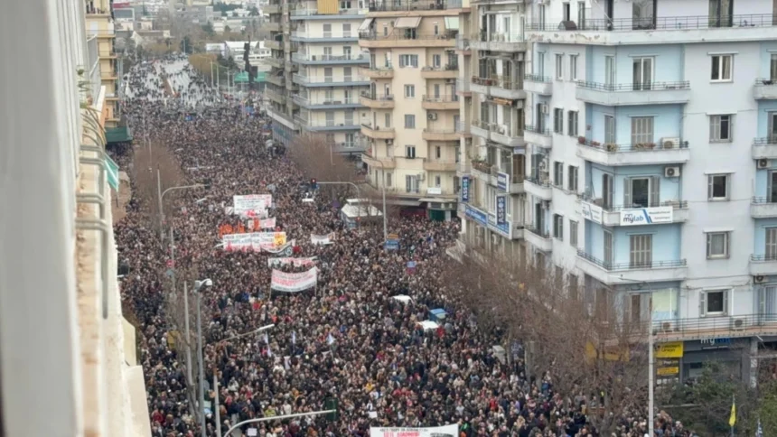 Λαοθάλασσα στη Θεσσαλονίκη στην μεγάλη συγκέντρωση διαμαρτυρίας μετά από κάλεσμα του Συλλόγου Συγγενών Θυμάτων Τεμπών,που ζητούν άμεση έρευνα για τα αίτια της σιδηροδρομικής τραγωδίας και απόδοση δικαιοσύνης.