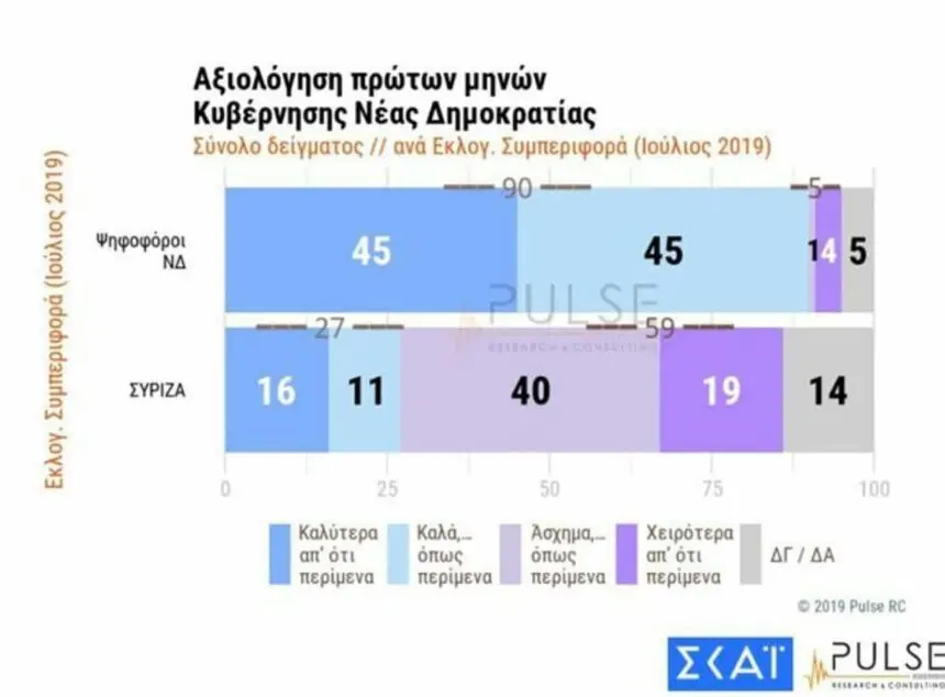 Στο ερώτημα πώς αξιολογούν οι πολίτες το έργο της κυβέρνησης τους πρώτους μήνες, το 28% υποστηρίζει «καλύτερα από ό,τι περίμενα» και το 30% «καλά όπως περίμενα».