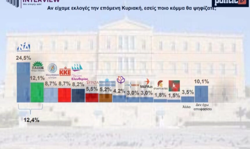 Η Νέα Δημοκρατία παραμένει πρώτη (24,5%) στην πρόθεση ψήφου, αλλά αποτυπώνεται ξεκάθαρα η πτωτική της πορεία. Το ΠΑΣΟΚ πέφτει στο 12,1% (από το 15% του Ιανουαρίου) ενώ άνοδο σημειώνει η Ελληνική Λύση (8,7%) αλλά και το ΚΚΕ (8,7%) τα οποία ισοφαρίζουν στην τρίτη θέση. Η Πλεύση Ελευθερίας καταγράφει εντυπωσιακή άνοδο και περνάει το κατώφλι του 5%, και από το 3,9% φτάνει στο 8,2%. Στην έκτη θέση με ποσοστό 5,5% βρίσκεται ο ΣΥΡΙΖΑ και ακολουθεί η Φωνή Λογικής με 5,2%, το Κίνημα Δημοκρατίας με 4,2%, η ΝΙΚΗ και το ΜέΡΑ 25 με 3% αντίστοιχα. Η Νέα Αριστερά είναι στο 1,5%.