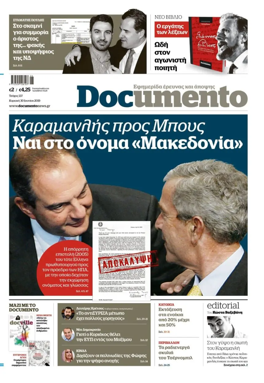 Επιστολή του πρώην πρωθυπουργού, Κώστα Καραμανλή, προς τον τότε πρόεδρο των ΗΠΑ, Τζορτζ Μπους, δημοσιεύει η εφημερίδα Documento.