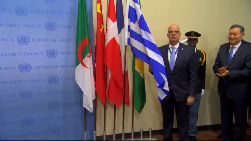 Σε μια περήφανη στιγμή για τη χώρα, η Ελλάδα ύψωσε την σημαία της στο Συμβούλιο Ασφαλείας των Ηνωμένων Εθνών, κατά τη διάρκεια της τελετής εγκατάστασης σημαίας που πραγματοποιήθηκε σήμερα. Η Ελλάδα, μαζί με τη Δανία, το Πακιστάν, τον Παναμά και τη Σομαλία, αναλαμβάνει για τα επόμενα δύο χρόνια τον ρόλο του εκλεγμένου μέλους του Συμβουλίου.