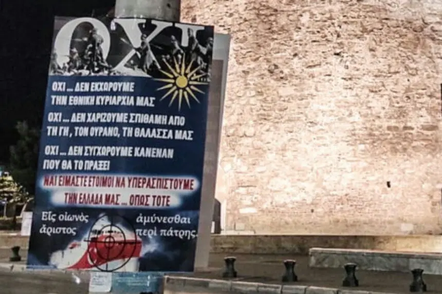 Άγνωστοι τοποθέτησαν αφίσες με πατριωτικά μηνύματα σε διάφορα σημεία του κέντρου της Θεσσαλονίκης. Κάποιες από τις αφίσες κολλήθηκαν στις εισόδους πολυκατοικιών, στις οποίες στεγάζονται γραφεία βουλευτών της Νέας Δημοκρατίας.