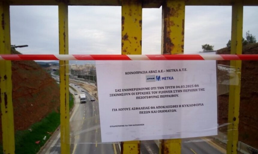 Κλειστή θα είναι από σήμερα, Τρίτη 4 Μαρτίου, η πεζογέφυρα της Περραιβού, λόγω των εργασιών για το Flyover, σύμφωνα με σχετική ανακοίνωση που αναρτήθηκε στο σημείο από την κοινοπραξία που εκτελεί το έργο.