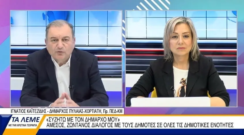 Καλεσμένος της εκπομπής «ΤΑ ΛΕΜΕ» στη ΒΕΡΓΙΝΑ ΤΗΛΕΟΡΑΣΗ και της δημοσιογράφου Χριστίνας Τσόρμπα βρέθηκε ο δήμαρχος Πυλαίας-Χορτιάτη και πρόεδρος ΠΕΔ-ΚΜ Ιγνάτιος ΚαΪτεζίδης, με αφορμή τις ασφαλτοστρώσεις που ξεκίνησαν σε κάθε γειτονιά του δήμου μέσα από ένα μεγάλο πρόγραμμα 10 εκ. ευρώ. Ανάμεσα στα άλλα ο δήμαρχος αναφέρθηκε και στον θεσμό «Συζητώ με τον δήμαρχό μου» που έχει καθιερώσει εδώ και 20 χρόνια από την εποχή που ήταν δήμαρχος Πανοράματος.