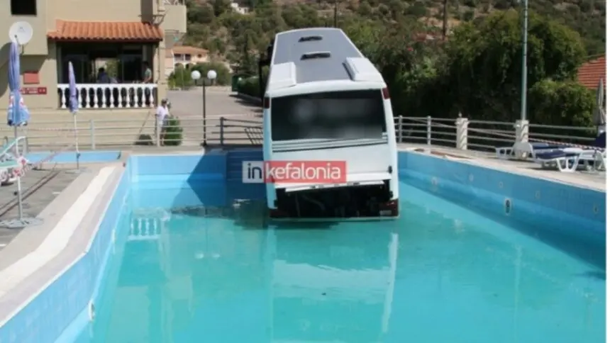 Ένα πρωτοφανές περιστατικό σημειώθηκε στην Κεφαλονιά, όταν λεωφορείο έπεσε σε πισίνα ξενοδοχείου στα Τραυλιάτα.