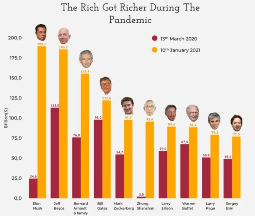 Οι περιουσίες των 10 πλουσιότερων ανθρώπων στον κόσμο αυξήθηκαν κατά 540 δισεκατομμύρια δολάρια δηλ. μισό τρις $ από τον Μάρτιο του 2020, ενώ ακόμη 200- 500 εκατομμύρια άνθρωποι προστέθηκαν και διαβιούν στη φτώχεια το 2020, αναφέρει το Oxfam.