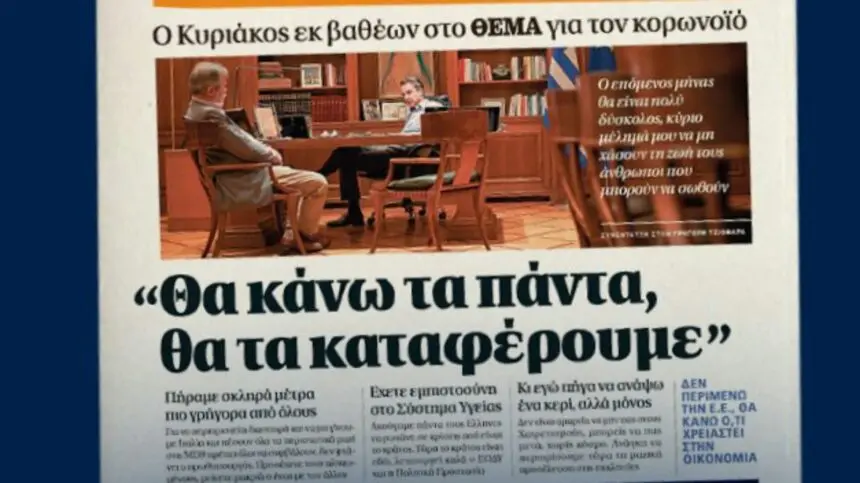 Σε συνέντευξη στο”Πρώτο Θέμα”, ο πρωθυπουργός αναφέρει πως “το μεγάλο πρόβλημα με αυτή την ασθένεια δεν είναι το 80 ή 85% που θα την περάσουν χωρίς καλά-καλά να την καταλάβουν. Είναι οι ευάλωτοι, όσοι έχουν χρόνιες παθήσεις, οι ηλικιωμένοι οι οποίοι μπορεί να χρειαστούν νοσοκομειακή περίθαλψη ή μπορεί να χρειαστούν πρόσβαση σε εντατική και σε κάποιου είδους αναπνευστική υποστήριξη”.