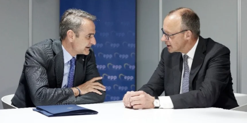 Ο πρωθυπουργός Κυριάκος Μητσοτάκης συναντήθηκε, στο περιθώριο του συνεδρίου του Ευρωπαϊκού Λαϊκού Κόμματος στη Βαλένθια της Ισπανίας, με τον επικεφαλής της κοινοβουλευτικής ομάδας του CDU και τον εκλεγμένο καγκελάριο της Γερμανίας Φρίντριχ Μερτς. Ο Πρωθυπουργός συνεχάρη τον κ. Μερτς για την εκλογική του νίκη και τόνισε ότι προσβλέπει σε στενή συνεργασία με τη νέα γερμανική κυβέρνηση για ζητήματα διμερούς και ευρωπαϊκού ενδιαφέροντος.