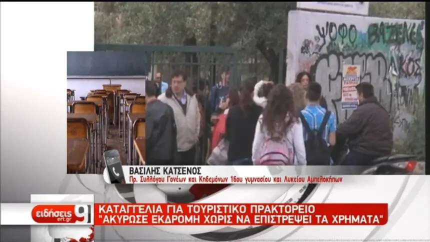 Γονείς και εκπαιδευτικοί από το 16ο Λύκειο Αμπελοκήπων καταγγέλλουν στην ΕΡΤ πως η προγραμματισμένη εκπαιδευτική εκδρομή στις Βρυξέλλες, στην οποία θα συμμετείχαν 28 μαθητές, ακυρώθηκε και ενώ είχαν δώσει προκαταβολή, το πρακτορείο δεν έχει επιστρέψει τα χρήματα στο σχολείο.