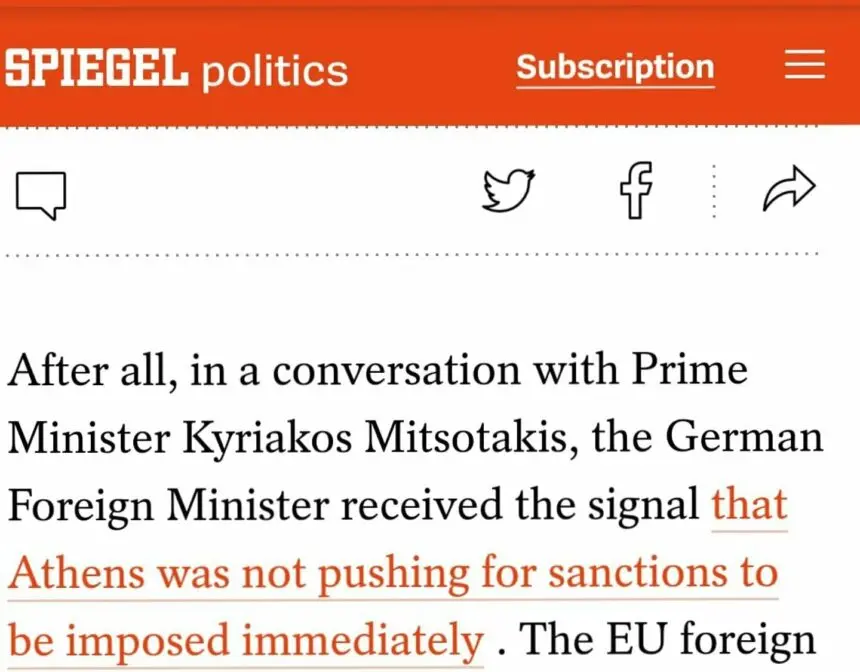 Συγκεκριμένα το Spiegel αναφέρει: «Σε τελική ανάλυση, σε μια συνομιλία με τον Πρωθυπουργό Κυριάκο Μητσοτάκη, ο Γερμανός Υπουργός Εξωτερικών έλαβε το μήνυμα ότι η Αθήνα δεν θα πιέσει να επιβληθούν άμεσα κυρώσεις. Ο εκπρόσωπος εξωτερικής πολιτικής της ΕΕ, Josep Borrell, έχει ήδη κληθεί από τα κράτη μέλη να καταρτίσει κατάλογο πιθανών κυρώσεων. Θα ήταν αρκετό για την ελληνική πλευρά, το αποτέλεσμα της συνομιλίας, εάν η Τουρκία σταματούσε τις έρευνες».