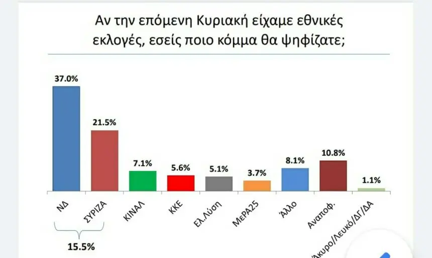 ΣΤΑΘΕΡΑ ΠΡΩΤΗ Η ΝΔ ΜΕ 37% ΣΤΗΝ ΠΡΟΘΕΣΗ ΨΗΦΟΥ ΚΑΙ ΔΙΑΦΟΡΑ 15,5% ΑΠΟ ΤΟΝ ΣΥΡΙΖΑ