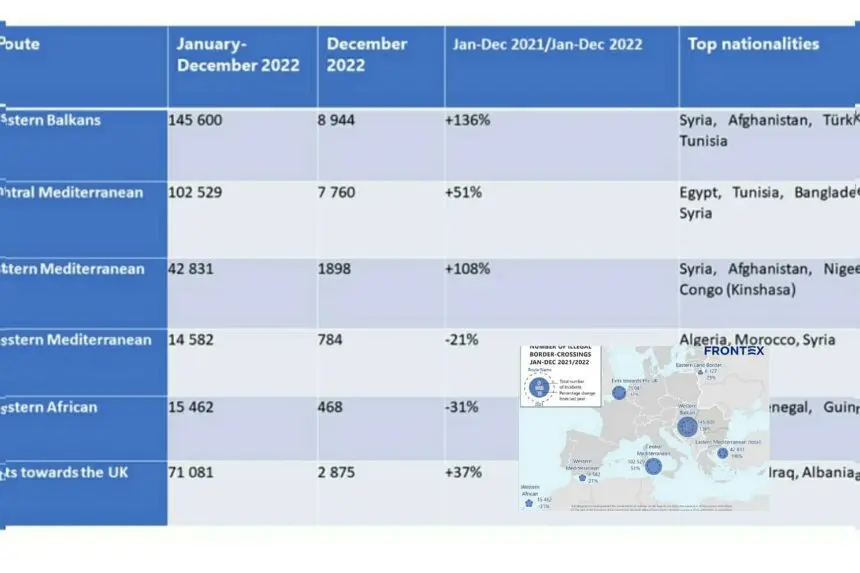 Ενώ ο Υπουργός Προστασίας του Πολίτη από την Αλεξανδρούπολη σε 27 πρέσβεις ξένων χωρών επισημαίνει επικοινωνιακά ότι το 2022 έχει αποτραπεί η είσοδος 260.000 παρανόμων μεταναστών στον Έβρο με σύλληψη 1.500 διακινητών, τα στοιχεία της FRONTEX είναι αποκαλυπτικά.