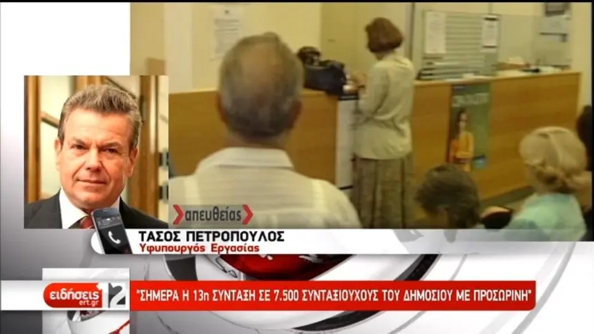 Πιστώνεται σήμερα η 13η σύνταξη για τους συνταξιούχους του δημοσίου που λαμβάνουν προσωρινή σύνταξη και στους οποίους δεν είχε καταβληθεί την Παρασκευή. ‘Οπως δήλωσε στην ΕΡΤ ο υφυπουργός Εργασίας Τάσος Πετρόπουλος οι δικαιούχοι θα δουν τα χρήματα σήμερα στα μηχανήματα ανάληψης ΑΤΜ και αύριο στις τράπεζες.