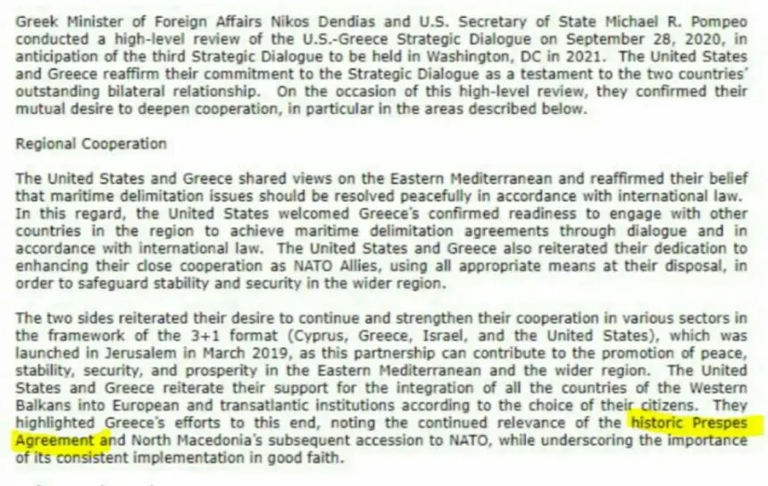 «The United States and Greece reiterate their support for the integration of all the countries of the Western Balkans into European and transatlantic institutions according to the choice of their citizens. They highlighted Greece’s efforts to this end, noting the continued relevance of the historic Prespes Agreement and North Macedonia’s subsequent accession to NATO, while underscoring the importance of its consistent implementation in good faith».Αργότερα η «ιστορική» συμφωνία εξαφανίστηκε και έτσι η «ιστορική Συμφωνία των Πρεσπών – historic Prespes Agreement» γίνεται απλά «Συμφωνία των Πρεσπών – Prespes Agreement».Η φωτογραφία του αρχικού κειμένου είναι αδιάψευστος μάρτυρας αυτής της εκ των υστέρων «επέμβασης» στην κοινή δήλωση Ελλάδας και ΗΠΑ. Ο χαρακτηρισμός σβήστηκε και από τις αντίστοιχες ανακοινώσεις του State Department και της αμερικανικής πρεσβείας στην Ελλάδα.