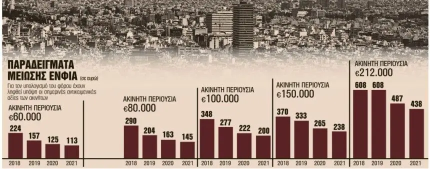 Οι ιδιοκτήτες ακίνητων θα δουν τον λογαριασμό του ΕΝΦΙΑ να αρχίσει να ξεφουσκώνει σημαντικά από το 2020. Σύμφωνα με το σχέδιο που προωθεί η κυβέρνηση, ο φόρος ακινήτων τον επόμενο έτος θα μειωθεί κατά 20% και το 2021 κατά 10%. Αυτό για έναν φορολογούμενο ο οποίος σήμερα πληρώνει για τα ακίνητά του 1.000 ευρώ, το 2020 θα δει τη φορολογική του επιβάρυνση να μειώνεται στα 800 ευρώ και το 2020 στα 720 ευρώ.