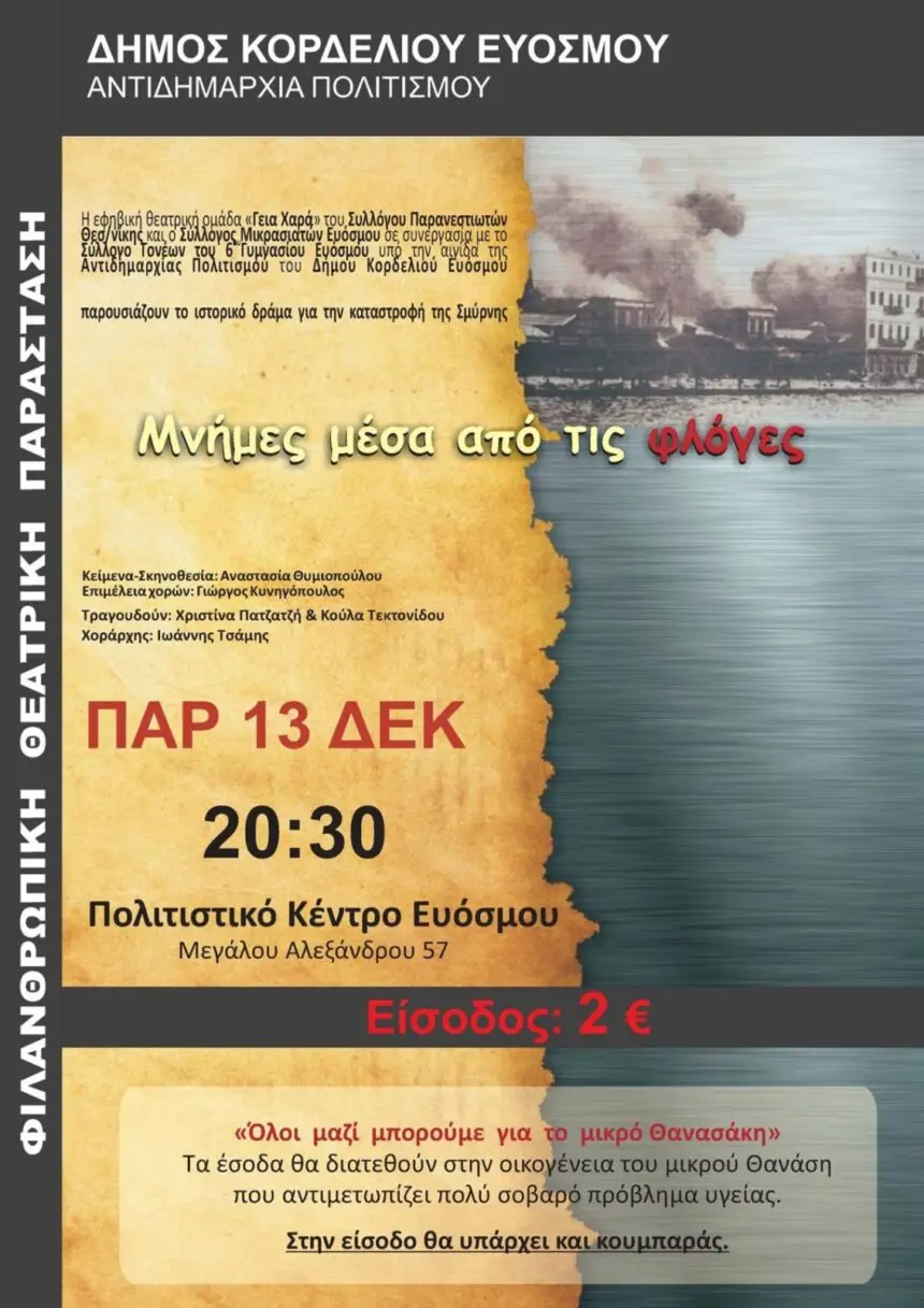 Συγκεκριμένα, το εφηβικό τμήμα της θεατρικής ομάδας “Γεια Χαρά” του Συλλόγου Παρανεστιωτών Θεσ/νίκης “Ο Νέστος” και ο Σύλλογος Μικρασιατών Ευόσμου ένωσαν το κέφι και το μεράκι τους για τον μικρό Θανασάκη που χρειάζεται τη βοήθεια όλων μας. Σε συνεργασία με το Σύλλογο Γονέων του 6ου Γυμνασίου Ευόσμου και υπό την αιγίδα της Αντιδημαρχίας Πολιτισμού του Δήμου Κορδελιού-Ευόσμου, παρουσιάζουν το ιστορικό δράμα για την καταστροφή της Σμύρνης: «Μνήμες μέσα από τις φλόγες»