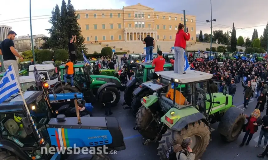 Παρατεταγμένα μπροστά στη Βουλή και στο μνημείο του Αγνώστου Στρατιώτη είναι τα τρακτέρ των αγροτών, που έφτασαν στο κέντρο της Αθήνας νωρίτερα.