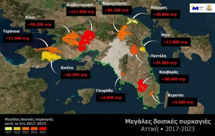 Σύμφωνα με το meteo.gr του Εθνικού Αστεροσκοπείου Αθηνών, από το 2017 μέχρι και το τέλος Ιουλίου 2023, 11 μεγάλες πυρκαγιές έχουν κάψει περισσότερα από 550.000 στρέμματα.Αυτό προκύπτει από τις αναφορές από την Υπηρεσία Ταχείας Χαρτογράφησης Copernicus και το Ευρωπαϊκό Παρατηρητήριο για Δασικές Πυρκαγιές (EFFIS). Η περίμετρος των καμένων εκτάσεων δίνεται στο χάρτη που ακολουθεί.