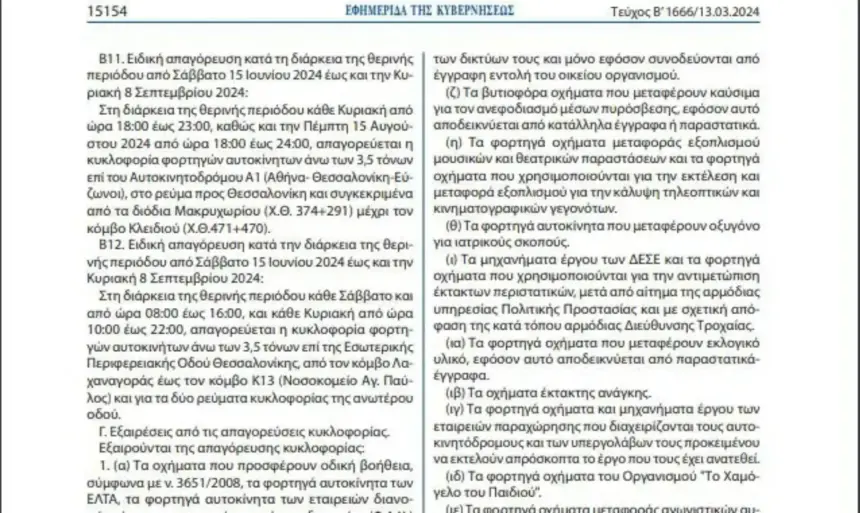 Θα ισχύσει κατά την διάρκεια της θερινής περιόδου από Σάββατο 15 Ιουνίου 2024 έως και την Κυριακή 8 Σεπτεμβρίου 2024Η απόφαση δημοσιεύθηκε στο ΦΕΚ. Η απαγόρευση αφορά τα φορτηγά άνω των 3,5 τόνων τα σαββατοκύριακα.