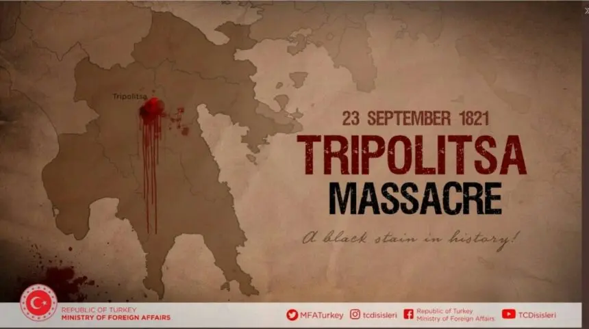 Το τουρκικό υπουργείο Εξωτερικών, σε μια άκρως προκλητική ενέργεια, επιχειρεί να παρουσιάσει ως θύματα τους Τούρκους κατακτητές της Ελλάδας και χαρακτηρίζει την Απελευθέρωση της Τριπολιτσάς κατά την Επανάσταση του 1821, ως «απάνθρωπη σφαγή Τούρκων».Με αφορμή την συμπλήρωση χθες 200 χρόνων από την Απελευθέρωση της Τριπολιτσάς αναφέρει: «Έχουν περάσει 200 χρόνια από τότε που δεκάδες χιλιάδες Τούρκοι σφαγιάστηκαν βάναυσα και αλύπητα στην Τριπολιτσά. Η απάνθρωπη αυτή σφαγή, στόχο είχε να μην αφήσει ούτε έναν Τούρκο στην Πελοπόννησο και έτσι πέρασε στην ιστορία ως μαύρο στίγμα»