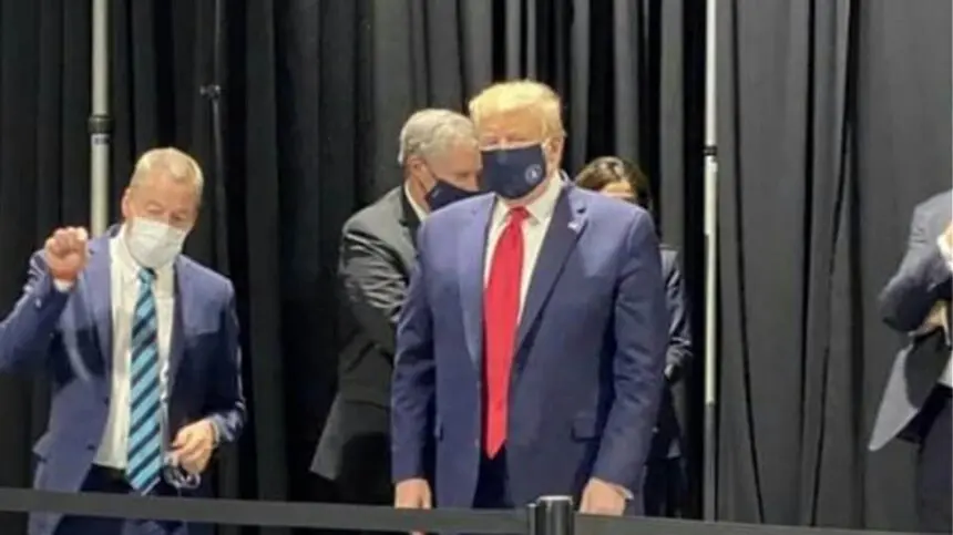 «Φόραγα μία προηγουμένως. Φόραγα μία εκεί πίσω. Αλλά δεν ήθελα να δώσω στους δημοσιογράφους την ικανοποίηση να το δουν», απάντησε σαρκαστικά ο Αμερικανός πρόεδρος. Λίγο αργότερα, επέδειξε στους δημοσιογράφους τη μάσκα του, χωρίς να τη βάλει. «Μου αρέσει πολύ. Ειλικρινά, νομίζω είμαι πιο ωραίος με τη μάσκα», αστειεύτηκε.