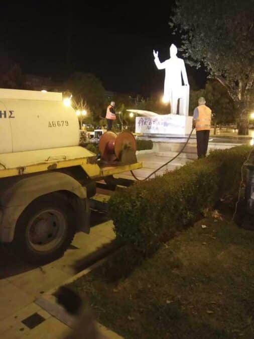 Συνεργεία καθαρισμού του δήμου Θεσσαλονίκης επενέβησαν άμεσα και καθάρισαν το άγαλμα από τα συνθήματα.