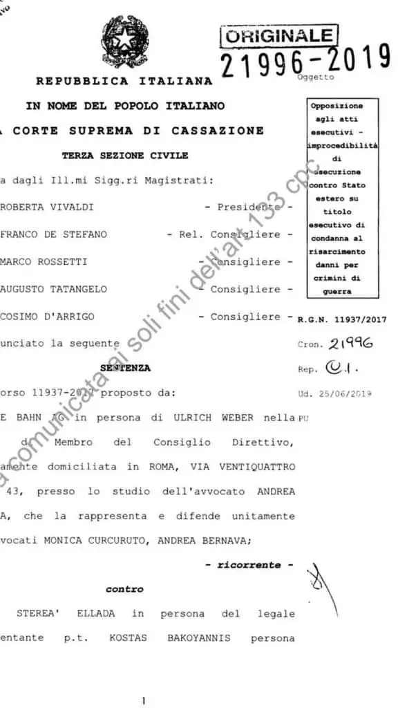 Το Ανώτατο Συνταγματικό Δικαστήριο της γείτονος χώρας, απορρίπτει, με την απόφαση υπ’αριθμόν 21995/2019, την προσφυγή της εταιρίας γερμανικών σιδηροδρόμων, που ζητούσαν να μην κατασχεθούν οι εισπράξεις από τα εισιτήρια των ιταλικών σιδηροδρόμων, προκειμένου να δοθούν ως πολεμικές επιδιορθώσεις των κατοίκων του Διστόμου.