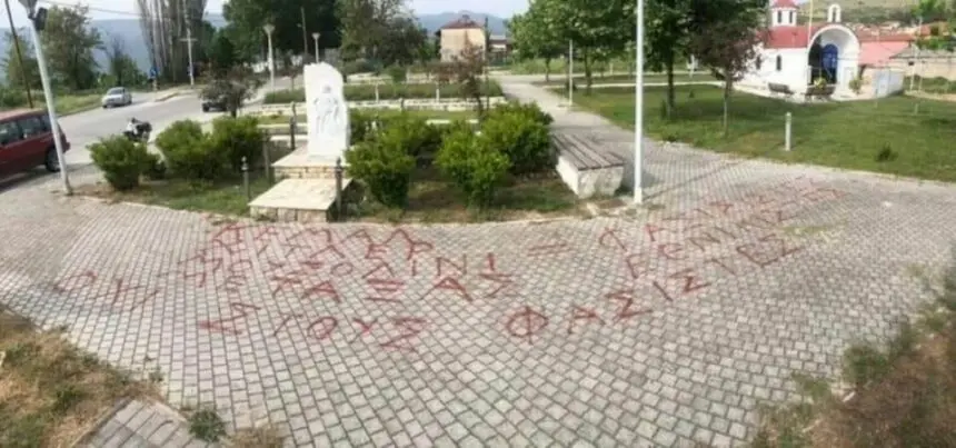 Οι άγνωστοι έγραψαν στο πλακόστρωτο του μνημείου: ΚΕΜΑΛ – ΧΙΤΛΕΡ – ΜΟΥΣΟΛΙΝΙ – ΜΕΤΑΞΑΣ = ΦΑΣΙΣΤΕΣ ΕΘΝΙΚΙΣΤΕΣ ΟΧΙ ΣΤΟΥΣ ΦΑΣΙΣΤΕΣ.