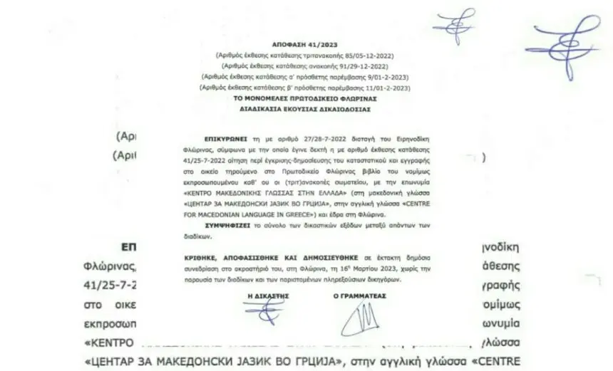 Εκείνη την ημέρα (16η Μαρτίου) το Πρωτοδικείο της Φλώρινας εξέδωσε την υπ’ αριθμ. 41/2023 απόφαση με την οποία απέρριψε τόσο την ανακοπή της εισαγγελέως όσο και την τριτανακοπή συλλόγου που είχε δικαστεί την ίδια μέρα (η δίκη είχε γίνει στις 2 Φεβρουαρίου 2023) ενώ ταυτόχρονα επικύρωσε την θετική απόφαση του Ειρηνοδικείου για το πιο πάνω φιλοσκοπιανό σωματείο. Έτσι το σωματείο αυτό πέτυχε την δεύτερη δικαστική του νίκη. Όλα όσα αναφέρονται στο Καταστατικό του σωματείου «Κέντρο Μακεδονικής Γλώσσας στην Ελλάδα» μπορούν πλέον να εφαρμοστούν νόμιμα στην χώρα μας.