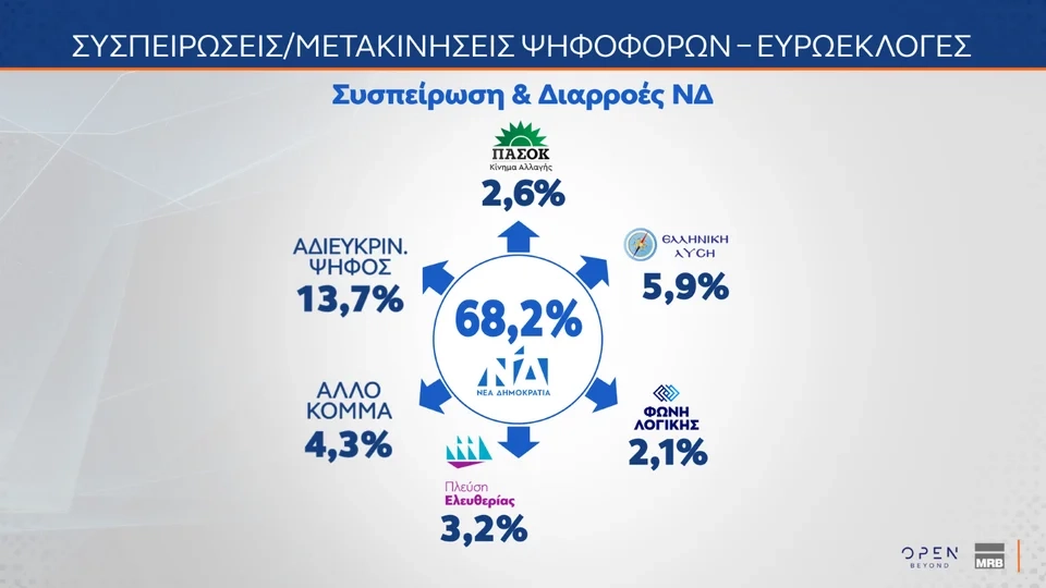 Στο μέσον τη τετραετίας, η Νέα Δημοκρατία έχει βαθμό συσπείρωσης 68,2%. Τη μεγαλύτερη διαρροή, της τάξης του 13,7%, έχει προς την αδιευκρίνιστη ψήφο. Ένα 5,9% στρέφεται προς την Ελληνική Λύση, 3,2% προς την Πλεύση, άλλο κόμμα 4,3%, 2,6% προς το ΠΑΣΟΚ και 2,1% προς τη Φωνή Λογικής.