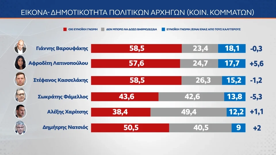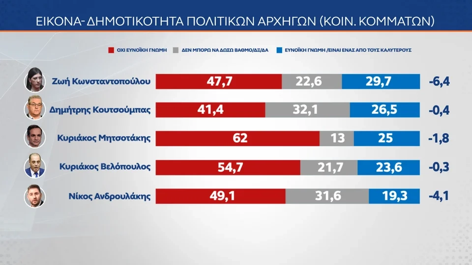 Στη δημοτικότητα των πολιτικών αρχηγών η Ζωή Κωνσταντοπούλου είναι πρώτη με 47,7% αρνητικές γνώμες και 29,7% ευνοϊκές. Ο Δημ. Κουτσούμπας ακολουθεί με 41,4% αρνητικές και 26,5% θετικές και ο Κυριάκος Μητσοτάκης με 62% αρνητικές και 25% θετικές.