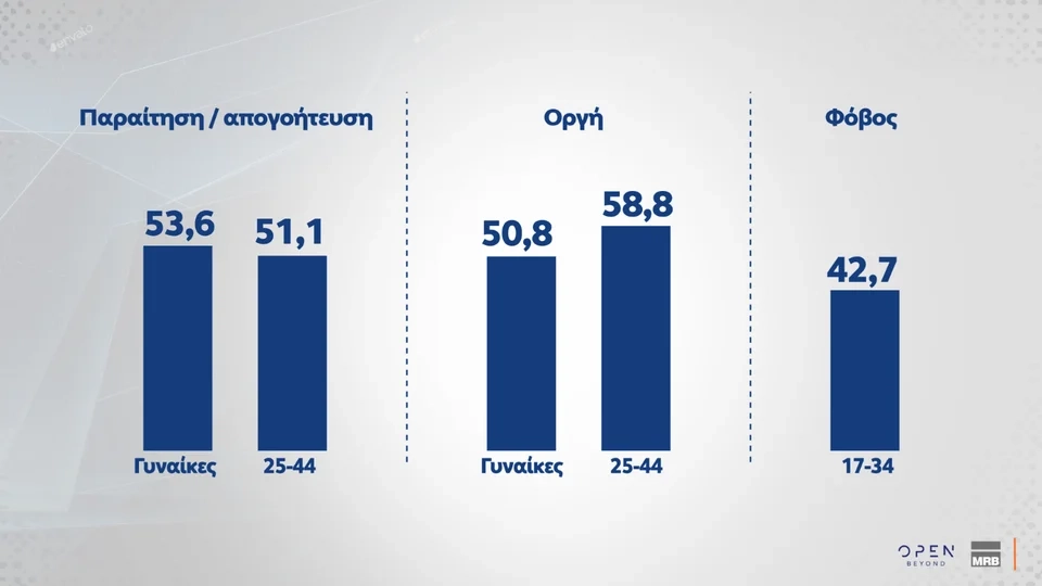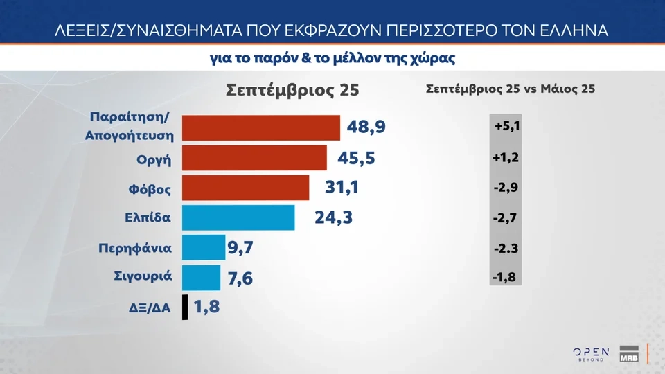Η παραίτηση και η απογοήτευση κυριαρχεί και μάλιστα με ανεβασμένα ποσοστά, στο 48,9% (άνοδος +5,1%), έπεται η οργή με 45,5% και ο φόβος με 31,1%, αν και έχει υποχωρήσει κατά σχεδόν τρεις μονάδες.