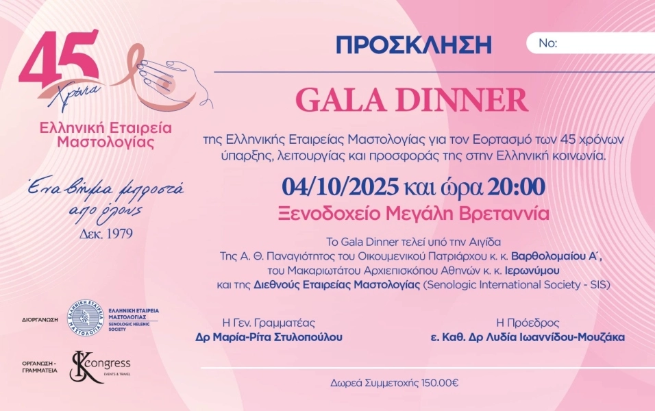 Με ιδιαίτερη χαρά και υπερηφάνεια, η Ελληνική Εταιρεία Μαστολογίας (ΕΕΜ) ανακοινώνει τη διοργάνωση της επετειακής εκδήλωσης Gala Dinner, το Σάββατο 4 Οκτωβρίου 2025, στο εμβληματικό ξενοδοχείο Μεγάλη Βρετανία στο Σύνταγμα, με αφορμή τη συμπλήρωση 45 χρόνων αδιάλειπτης επιστημονικής και κοινωνικής προσφοράς στον τομέα της Μαστολογίας.