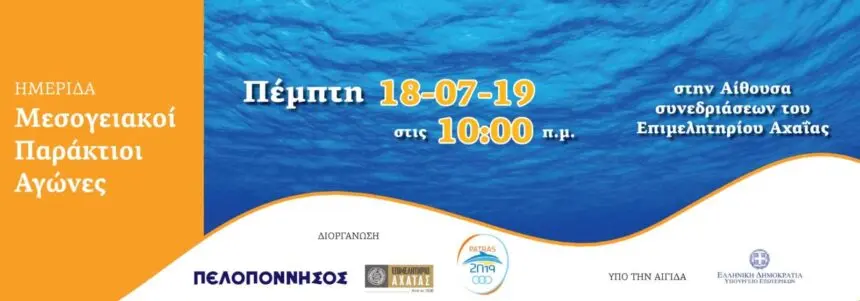 Στο πλαίσιο των Μεσογειακών Παράκτιων Αγώνων και υπο την Αιγίδα του Υπουργείου Εξωτερικών η εφημερίδα «ΠΕΛΟΠΟΝΝΗΣΟΣ», το Επιμελητήριο Αχαΐας και η Ο.Ε. Μεσογειακών Παράκτιων Αγώνων οργανώνουν την ημερίδα “Μεσογειακοί Παράκτιοι Αγώνες” στην οποία θα συμμετάσχουν Πρέσβεις & Εμπορικοί Ακόλουθοι των 26 χωρών που συμμετέχουν στους Παράκτιους Αγώνες: Αλβανία, Αλγερία, Ανδόρα, Βοσνία & Ερζεγοβίνη, Κροατία, Κύπρος, Αίγυπτος, Ισπανία, Γαλλία, Ελλάδα, Ιταλία, Κοσσυφοπέδιο, Λιβύη, Λίβανος, Μαρόκο, Σκόπια, Μάλτα, Μαυροβούνιο, Μονακό, Πορτογαλία, Σλοβενία, Άγιος Μαρίνος, Σερβία, Συρία, Τυνησία, Τουρκία.