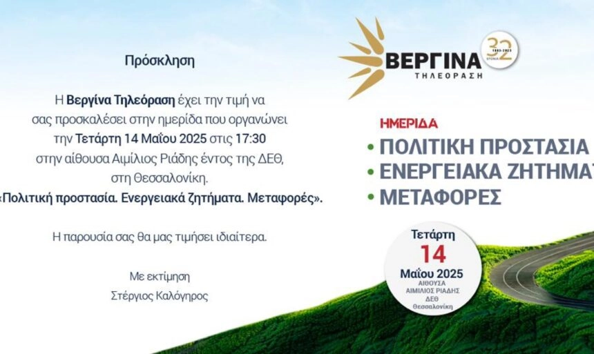 Ημεριδα : Πολιτική προστασία , Ενεργειακά ζητήματα, Μεταφορές , από την Βεργίνα Τηλεόραση την Τετάρτη 14 Μαϊου στις 17.30 στην αίθουσα Αιμίλιος Ριαδης της ΔΕΘ.