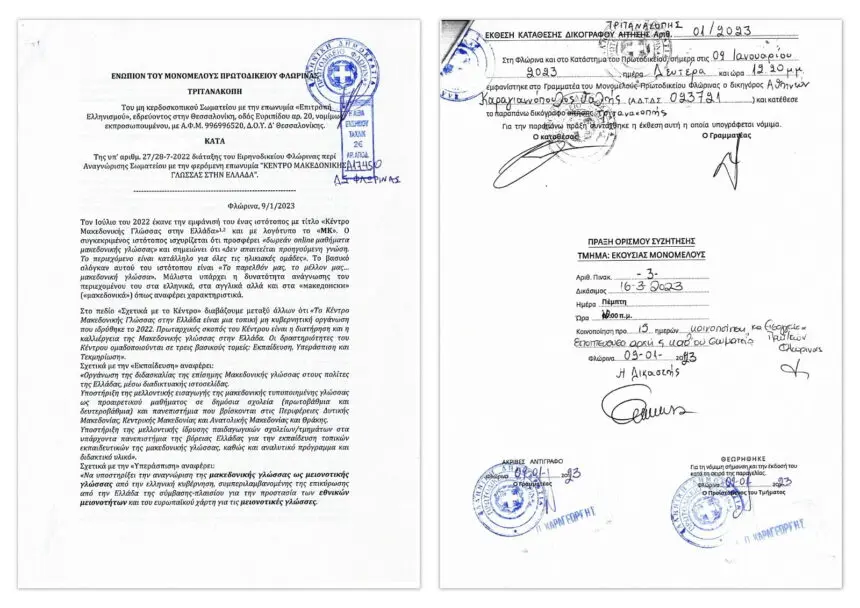 Στις 9 Ιανουαρίου η ΕΠΙΤΡΟΠΗ ΕΛΛΗΝΙΣΜΟΥ κατέθεσε τριτανακοπή κατά της υπ’ αριθμ. 27/28-7-2022 διάταξης του Ειρηνοδικείου Φλώρινας περί Αναγνώρισης Σωματείου με την φερόμενη επωνυμία «ΚΕΝΤΡΟ ΜΑΚΕΔΟΝΙΚΗΣ ΓΛΩΣΣΑΣ ΣΤΗΝ ΕΛΛΑΔΑ».