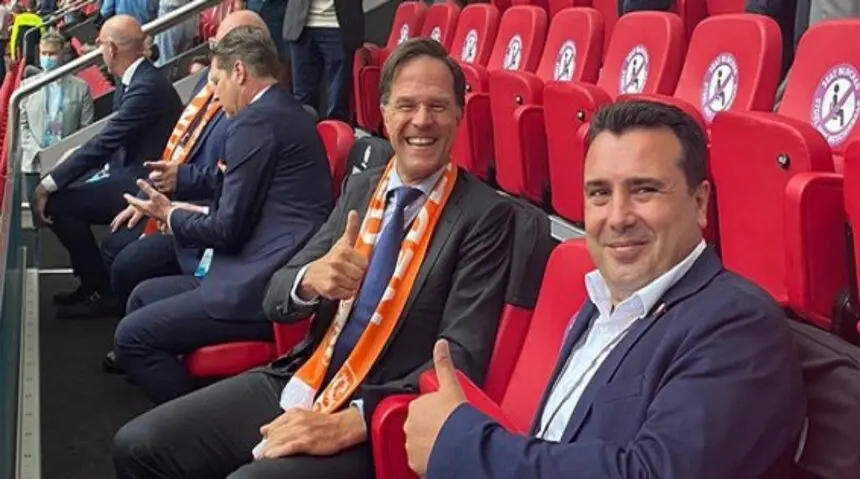 Ο πρωθυπουργός των Σκοπίων – που υποτίθεται είχε ξεκαθαρίσει ότι θα διόρθωνε το… “λάθος” στις φανέλες, φωτογραφίζεται μάλιστα με τον Ολλανδό ομόλογό του, Μαρκ Ρούτε, στις εξέδρες του γηπέδου του Άμστερνταμ.