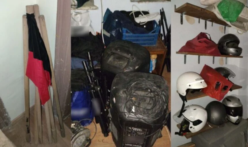 Όπως γνωστοποιεί με ανακοίνωσή της η Ελληνική Αστυνομία, εντός του χώρου βρέθηκαν μεταξύ άλλων ξύλινα κοντάρια, κράνη, μια σιδερογροθιά, προβολείς, υπολογιστές, ηχεία και μπαλαντέζες.