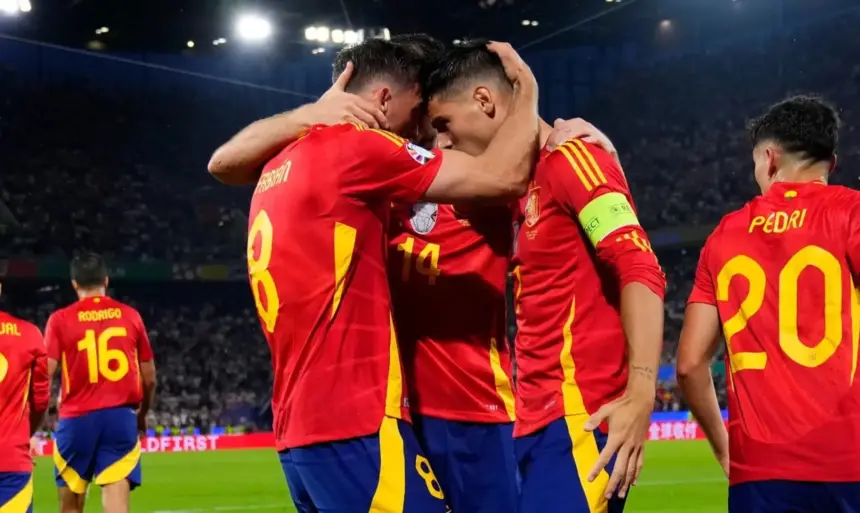 Η πρωτάρα Γεωργία μπήκε με ενθουσιασμό στο παιχνίδι και κατάφερε να προηγηθεί με αυτογκόλ του Λε Νορμάντ, η Ισπανία όμως παρέμεινε ψύχραιμη, έκανε την ανατροπή και τελικά επικράτησε με 4-1, παίρνοντας την πρόκριση για τους προημιτελικούς του Euro 2024, όπου θα αντιμετωπίσει τη Γερμανία.Όλα, πλέον, είχαν κριθεί οριστικά και με τη Γεωργία να έχει καταρρεύσει η Ισπανία βρήκε την ευκαιρία να πετύχει και 4ο γκολ, στο 83′, με ωραίο πλασέ του Όλμο (4-1), έχοντας πλέον μπροστά της τον προημιτελικό με αντίπαλο τη γηπεδούχο Γερμανία.Ισπανία: Σιμόν, Καρβαχάλ (81′ Χεσούς Νάβας), Λε Νορμάντ, Λαπόρτ, Κουκουρέγια (66′ Γκριμάλδο), Πέδρι, Ρόδρι (53′ Ντάνι Όλμο), Ρουίθ (81′ Μερίνο), Γιαμάλ, Μοράτα (67′ Οϊαρθάμπαλ), Γουίλιαμς.