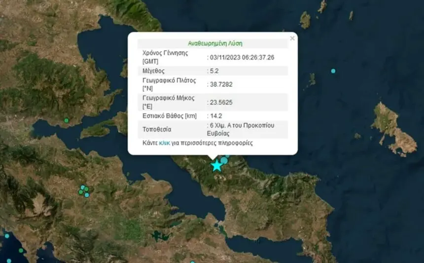 Σεισμός τώρα έγινε αισθητός στην Αττική αλλά και σε πολλές ακόμη περιοχές της χώρας. Οι πρώτες πληροφορίες έκαναν λόγο για 5 Ρίχτερ με επίκεντρο την Εύβοια. Ακολούθησε αναθεώρηση του Γεωδυναμικού Ινστιτούτου που ανέβαζε τον σεισμό στα 5,1 Ρίχτερ και η τελευταία κάνει λόγο για 5,2 βαθμούς της κλίμακας Ρίχτερ.