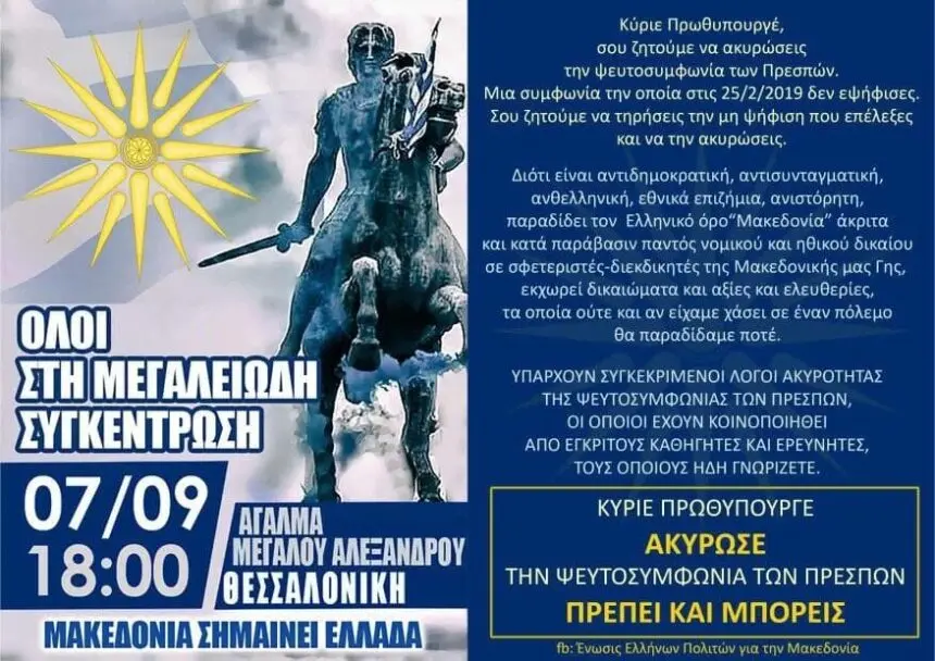 Το διαδικτυακό κάλεσμα απευθύνει η «Ένωσις Ελληνών Πολιτών για την Μακεδονία», για το Σάββατο 7 Σεπτεμβρίου στις 18.00, στο άγαλμα Μεγάλου Αλεξάνδρου.