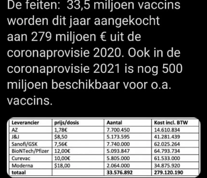 Σύμφωνα με το print screen που δημοσίευσε το HLN, η Ε.Ε. δαπανά μεταξύ 1,78 € και 18 $ ανά εμβόλιο κορονοϊού. Η τιμή ανά δόση που αναφέρεται για καθένα από τα έξι εμβόλια ήταν η εξής: