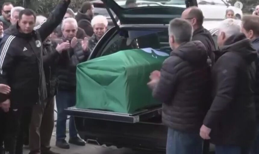 Μόλις έφτασε η σορός του Μίμη Δομάζου ακούστηκε από τα μεγάφωνα ο ύμνος του Παναθηναϊκού.