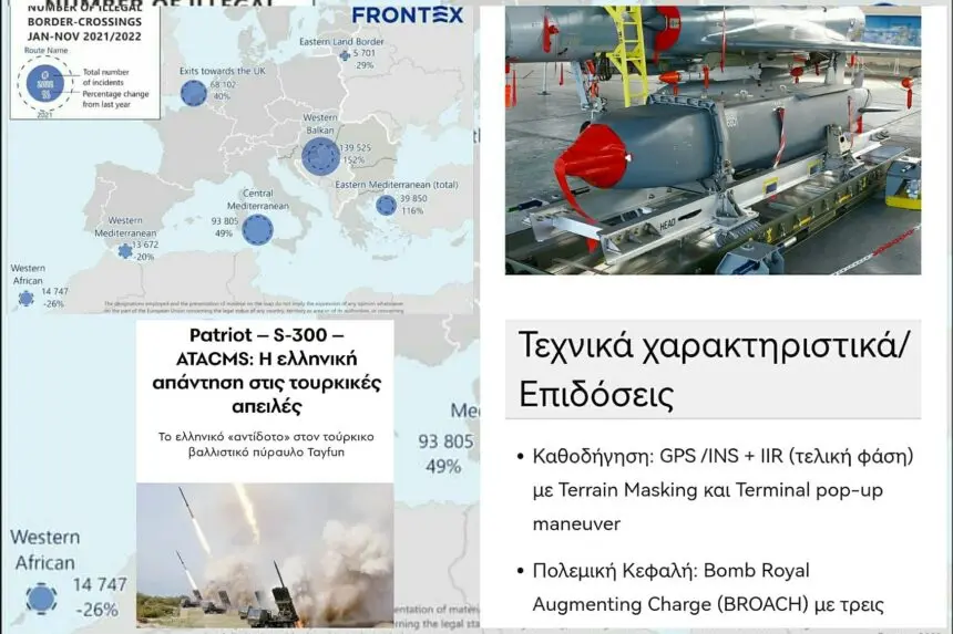 5. Η είσοδος παράνομων μεταναστών σύμφωνα με τα στοιχεία της FRONTEX αυξήθηκε με 39.850 στην χώρα μας από Έβρο και Νησιά Α Αιγαίου τους 11 πρώτους μήνες του 2022, ποσοστό 116% αύξησης σε σχέση με το ίδιο χρονικό διάστημα το 2021. Μεταξύ αυτών είναι από Syria : 8. 046, Afghanistan : 4. 355, Nigeria : 3. 857, Congo (Kinshasa) : 3.679 και Τουρκία 2.868. Επιχειρησιακά διαφαίνεται ότι παρόλα τα μέτρα που έχει πάρει η πολιτεία το σύστημα επιτήρησης συνεχίζει να έχει προβλήματα. Δεν υπάρχει καμία δικαιολογία ένα σκάφος με παράνομους μετανάστες να εισέρχεται από την Τουρκία μέχρι την Κρήτη ή την Καλαμάτα χωρίς να γίνεται αντιληπτό.