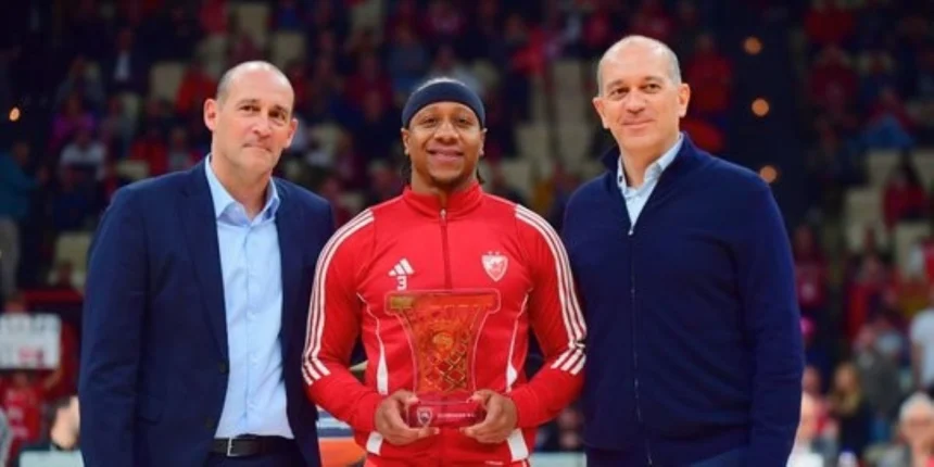 Με ανοιχτές «αγκάλες» υποδέχθηκαν οι πρόεδροι της ΚΑΕ Ολυμπιακός πίσω στο ΣΕΦ τον Αϊζέια Κάνααν. Οι κ.κ. Παναγιώτης και Γιώργος Αγγελόπουλος βράβευσαν τον Αμερικανό γκαρντ πριν από το τζάμπολ του αγώνα της 30ής αγωνιστικής της Ευρωλίγκα με τον Ερυθρό Αστέρα, θέλοντας έτσι να τον ευχαριστήσουν για την προσφορά του στον σύλλογο.