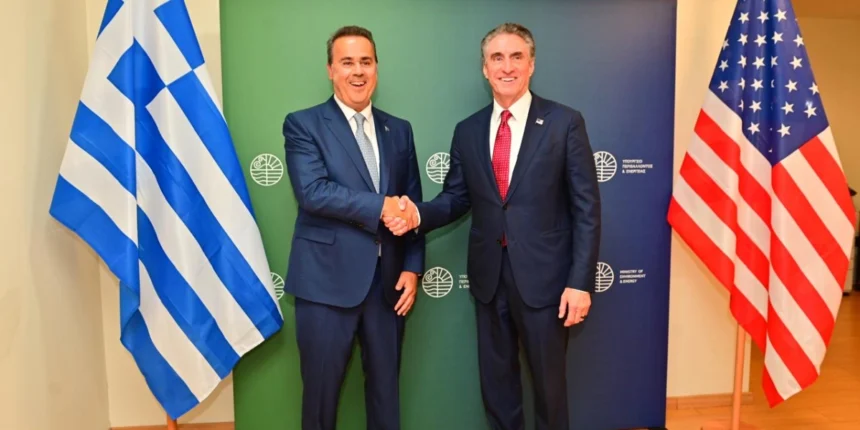 Οι ελληνο-αμερικανικές ενεργειακές σχέσεις, οι έρευνες υδρογονανθράκων σε συνέχεια της εκδήλωσης ενδιαφέροντος από την Chevron και η τροφοδοσία της περιοχής με φυσικό αέριο από τις ΗΠΑ μέσω των υποδομών Υγροποιημένου Φυσικού Αερίου της Ρεβυθούσας και της Αλεξανδρούπολης συζητήθηκαν στη συνάντηση που είχε σήμερα ο υπουργός Περιβάλλοντος και Ενέργειας, ο κ. Σταύρος Παπασταύρου με τον υπουργό Εσωτερικών και Επικεφαλής του Συμβουλίου Ενεργειακής Κυριαρχίας των ΗΠΑ, κ. Νταγκ Μπέργκαμ (Doug Burgum).
