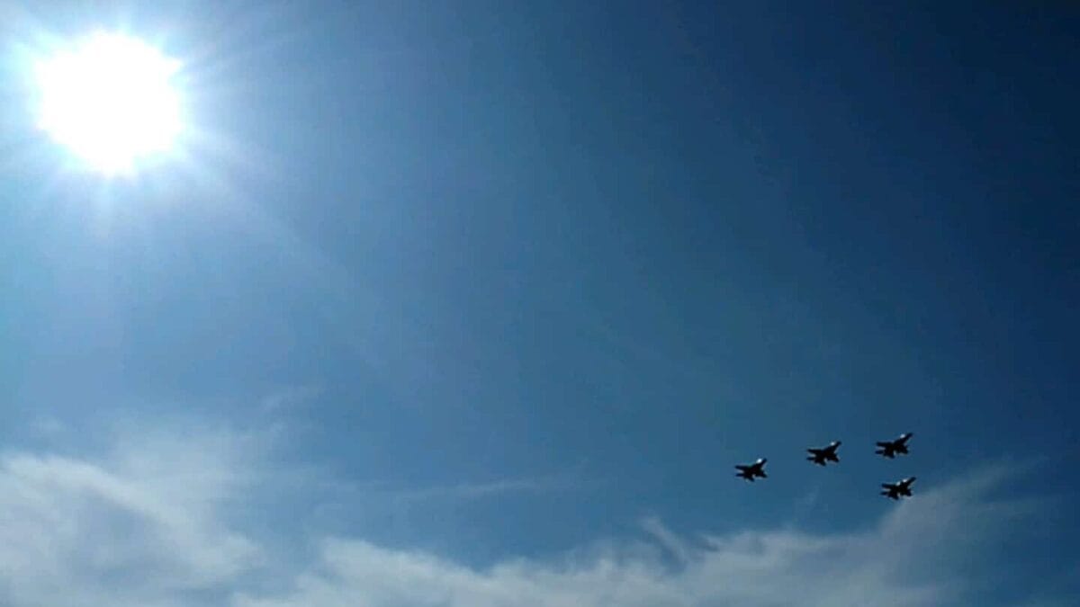 Δυο ζεύγη F-16 (4 σύνολο) και αμέσως μετά σχηματισμοί ελικοπτέρων του Στρατού Ξηράς: 3 Apache, 3 Kiowa Warrior, 3 Χιούι (UH-1H), έσκισαν τον ουρανό της Θεσσαλονίκης.