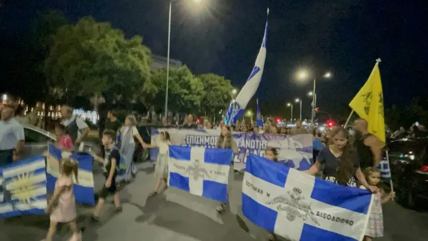 Άνθρωποι όλων των ηλικιών από διάφορες περιοχές στην κινητοποίηση. Κάποιοι από αυτούς κρατούσαν ελληνικές σημαίες, και θρησκευτικές εικόνες.