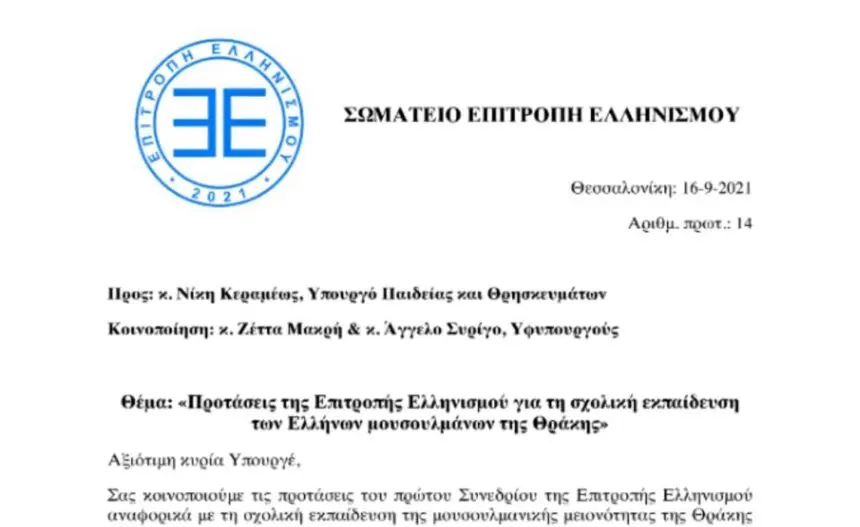 Θέμα: «Προτάσεις της Επιτροπής Ελληνισμού για τη σχολική εκπαίδευση των Ελλήνων μουσουλμάνων της Θράκης»